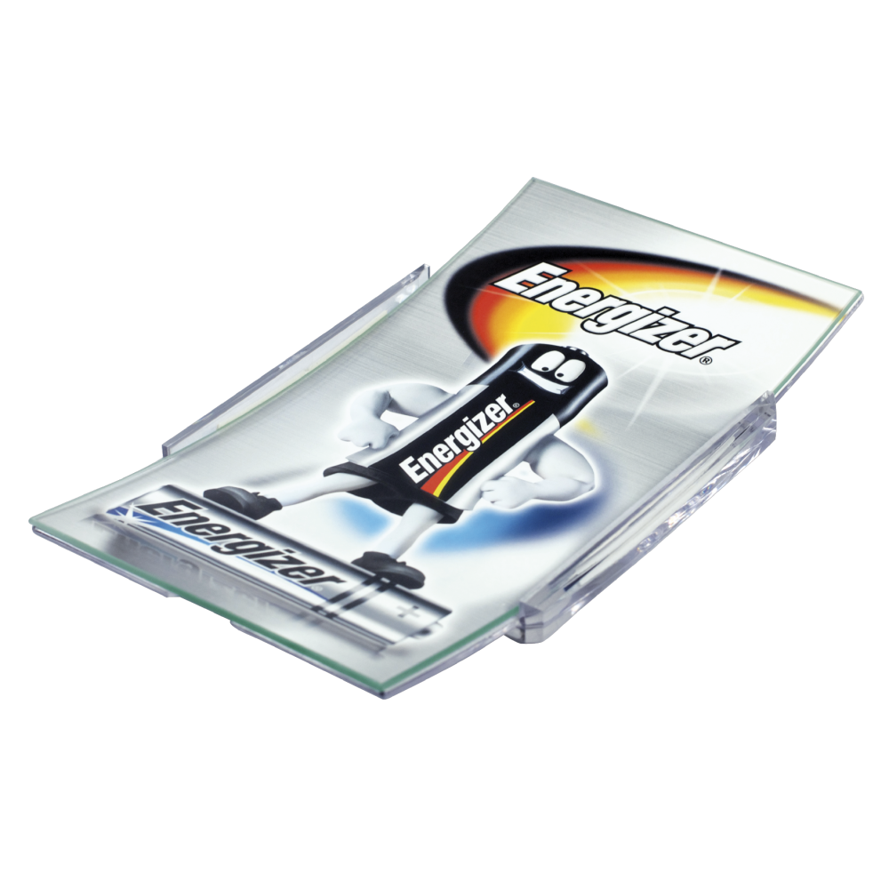 Der Werbeartikel Zahlteller PG2 hat eine rechteckige Form. Er besteht aus der unteren Kunststoff-Unterlage und der oberen Rahmenfassung, die ein gebogenes schlagfestes Glas darstellt. Die Elemente werden aneinender gefestigt und fixieren die Werbeetikette im Zahlteller. Der Zahlteller steht sicher auf dem Tresen, dank den auf der Unterlage angebrachten rutschfesten Füßen.