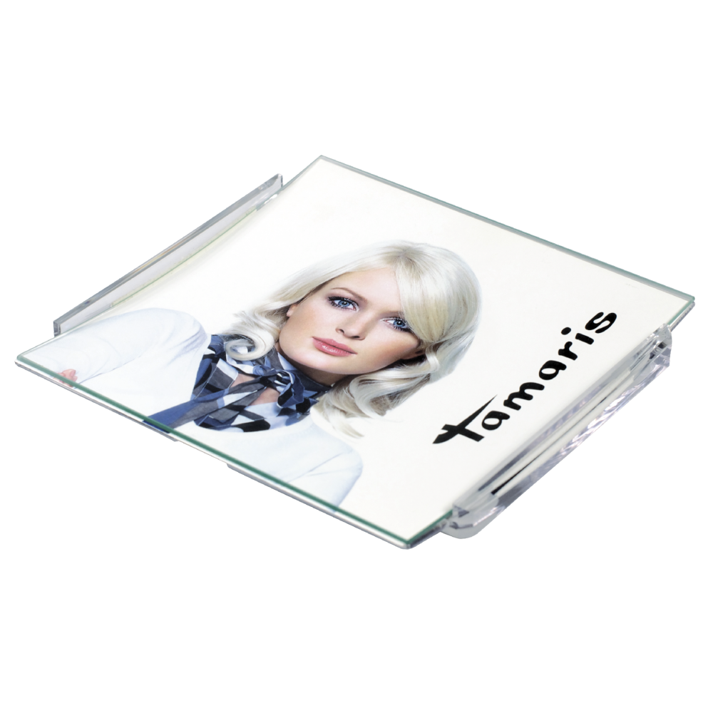 Der Zahlteller mit druck PG3 hat eine quadratische Form. Er besteht aus der unteren Kunststoff-Unterlage und der oberen Rahmenfassung, die ein gebogenes schlagfestes Glas darstellt. Die Elemente werden aneinender gefestigt und fixieren die Werbeetikette im Zahlteller. Der Zahlteller steht sicher auf dem Tresen, dank den auf der Unterlage angebrachten rutschfesten Füßen.