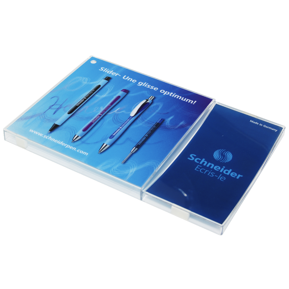 Money tray for counter desk with the additional surface for signing cheques or receipts during the payment. Cash tray PL9 consists of 2 elements, both can contain the advertising paper labels of different sizes (chalk overlay paper 130-150g; CMYK). We can print the advertising label and make insertion for you.