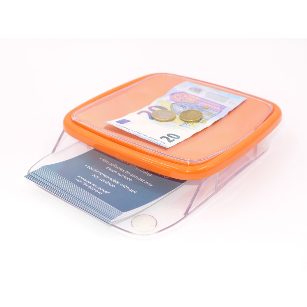 La bandeja para cambio en efectivo de información y publicidad PL2 Info consiste en un soporte donde se instala el material informativo (boceto, anuncio), la base con costados y la parte superior desplegable (la bandeja). Los componentes se unen mediante el cierre y la etiqueta de papel se encuentra en su interior.