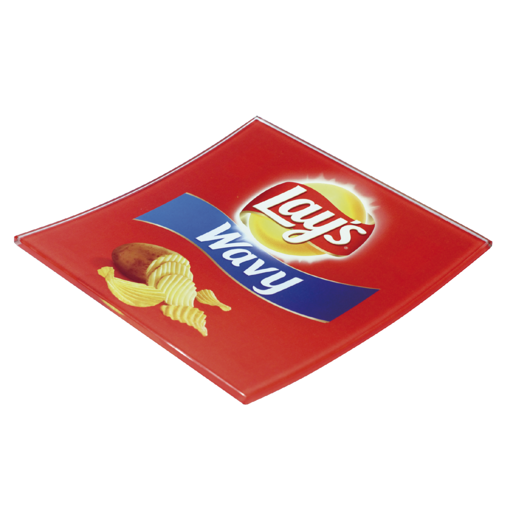 GLC Sticker 180x180 Plus - Il rendiresto in vetro quadrato in un vetro resistente e curvato (5mm). Sul lato inverso del rendiresto è incollata l’etichetta pubblicitaria protetta da graffi e danni. La stabilità sul bancone è garantita da 4 piedini antiscivolo.